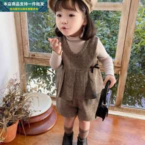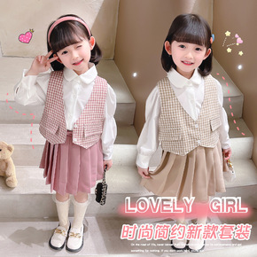 2021春装新款洋气宝宝时髦套装女小童格子马甲背心...