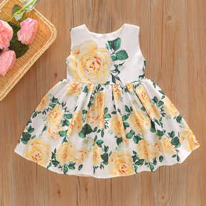 亚马逊热卖男女童梭织府绸大花朵印花烫钻公主连衣裙跨...
