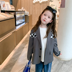 韩版童装2022秋新品儿童棋盘格西装外套女童宽松撞...
