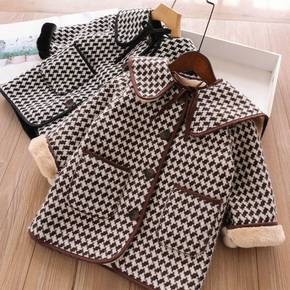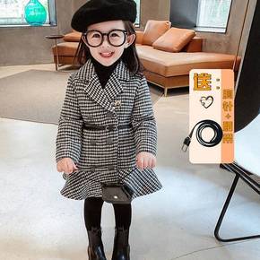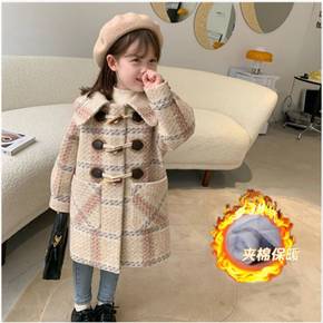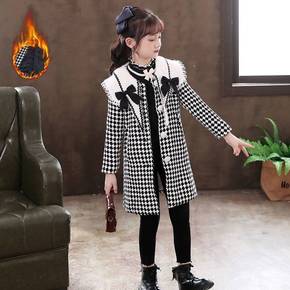 女童格子外套加厚女童毛呢外套格子中长款大衣儿童洋气...