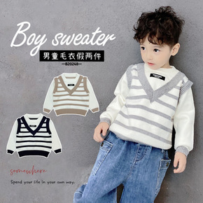 厂家批发男童毛衣假两件条纹加绒儿童毛衣背心假两件秋...