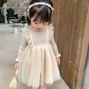 2022女童冬长袖毛衣亮片公主裙网纱渐变针织连衣裙...