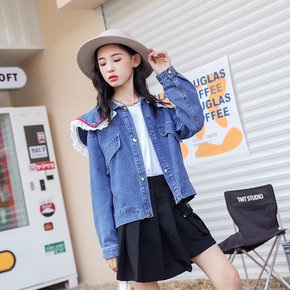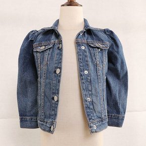 春秋款 女童蓝色泡泡肩短款牛仔外套翻领长袖牛仔衣 ...