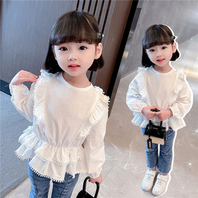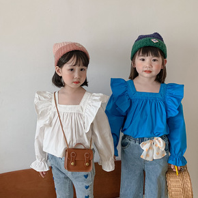 现货2021秋新款方领花边飞袖女童衬衫 长袖棉布韩...