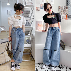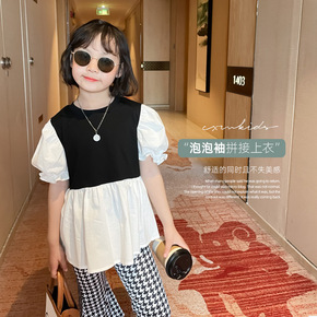 聪小妹2021夏款 女童韩版拼接泡泡袖娃娃衫 中大...