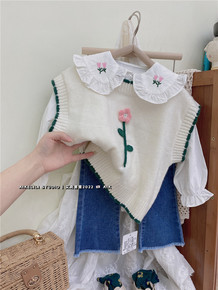 韩国童装2022秋季新款法式小清新女童花朵刺绣衬衫...