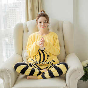 楠芬冬款长袖少女套装可爱蜜蜂圆领法兰绒睡衣加厚女士...