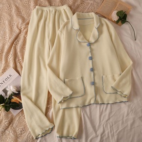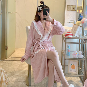 冬季加绒加厚纯色法兰绒少女甜美简约开衫珊瑚绒睡衣女...