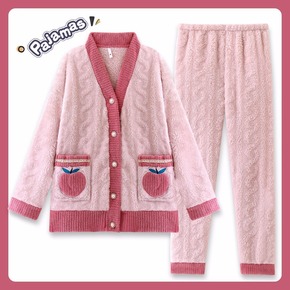 水蜜桃软绵绵睡衣女秋冬珊瑚绒甜美加厚保暖开衫家居服...