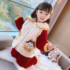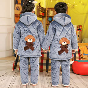 儿童睡衣法兰绒三层夹棉冬季加厚男童女童宝珊瑚绒家居...