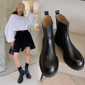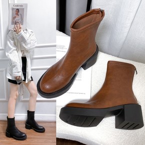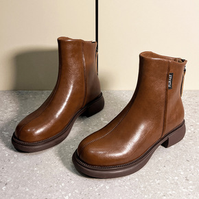 2022年秋冬新款女式皮靴复古粗跟短筒后拉链马丁靴...