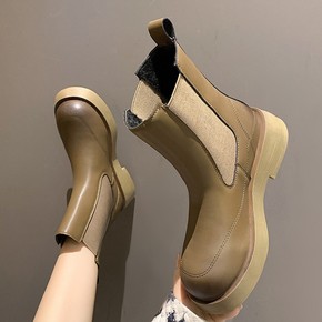 2022新款短筒女式皮靴圆头粗跟厚底马丁靴松紧一脚...