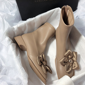 高定系列短靴女秋冬新品里外全皮黑色圆头中跟侧拉链女...