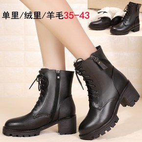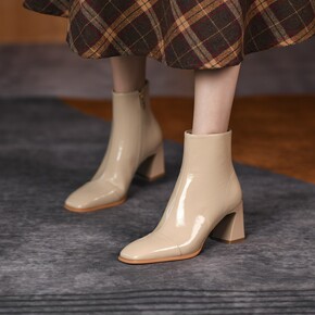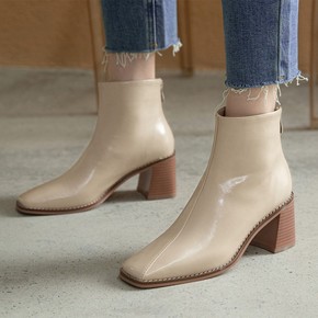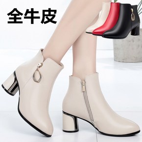 低筒靴2021秋冬季欧美女式短靴头层牛皮方头粗高跟...
