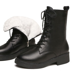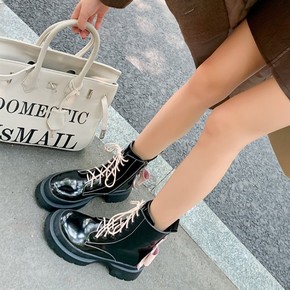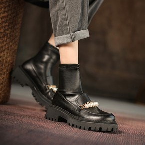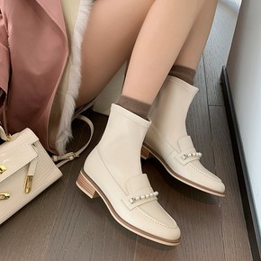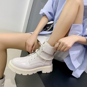 梅义狼2021秋冬新款甜美珍珠圆头粗跟马丁靴里外全...