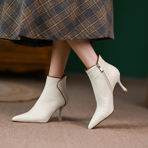 2021秋冬季新款女鞋尖头细跟高跟鞋拼色压花牛皮短...