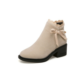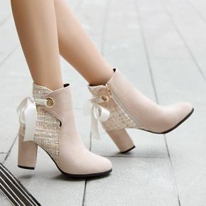 甜美蝴蝶结学生女靴秋冬中跟短靴子外贸大码小个子靴子...