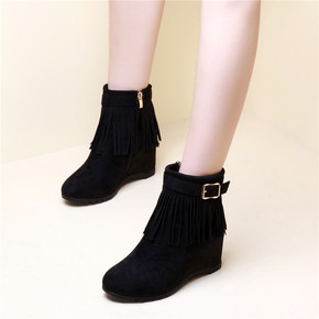 春秋季新款高跟短靴流苏女靴短筒马丁靴内增高英伦风女...