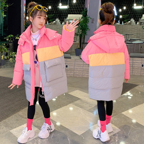 女童连帽棉衣2021冬装新款中大童中长款撞色棉服儿...