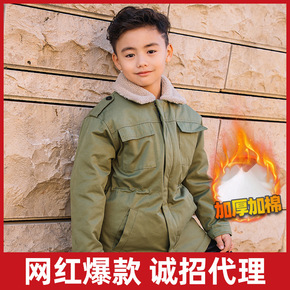 策马中长款儿童棉服秋冬加厚防风保暖男童棉袄军绿色童...