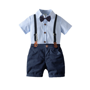 男童棉短袖条纹衬衫领节背带裤表演绅士四件套中小童宝...