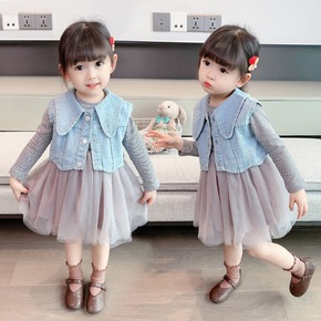 女童连衣裙牛仔马甲秋装2021新款网红宝宝公主裙洋...