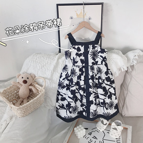 女童连衣裙2022夏季新款儿童度假风涂鸦花朵吊带裙...