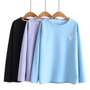华夫格刺绣卡通T恤大码女t春季宽松长袖圆领小卫衣2...