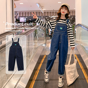 2020新款女童背带裤纯色欧美时尚儿童牛仔裤花边吊...