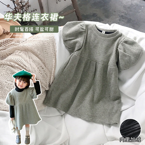 女童加绒连衣裙2021冬季新款韩版泡泡袖华夫格保暖...