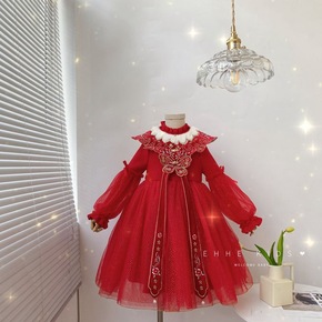 新年款女童连衣裙 红色蕾丝丝绒翻领礼裙 中小童甜美...