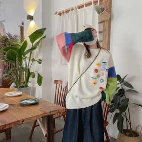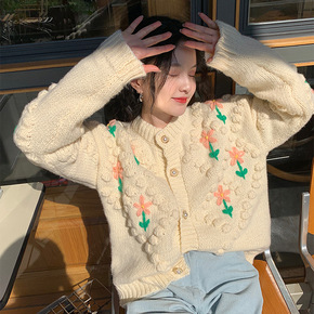 现货冬新款秋冬仿手工手打毛衣甜美宽松花朵针织开衫外...