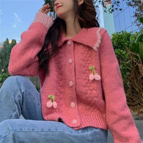 温柔粉色毛衣开衫女2022冬季甜美草莓针织加厚外套...