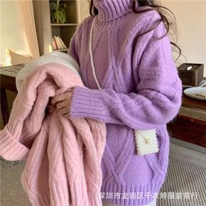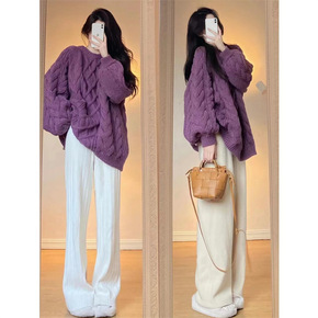 慵懒风上衣潮2022秋冬新款韩版圆领麻花针织衫紫色...