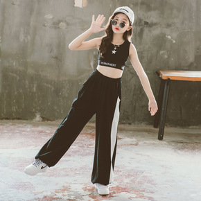 女童运动套装黑色街舞嘻哈阔腿裤春秋宽松儿童爵士舞运...