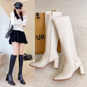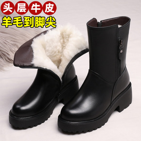 女圆头皮毛一体成熟女式皮靴侧拉链时装靴保暖长靴高跟...