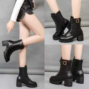 2022秋冬新款女式短靴欧美粗跟加绒系带皮带扣保暖...