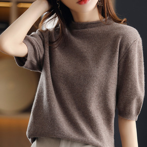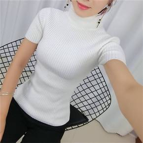 春夏新款女式羊毛短袖韩版半高领卷边针织衫宽松羊毛半...