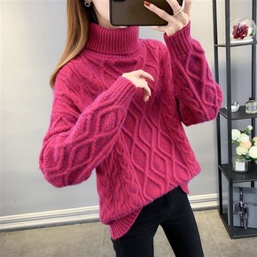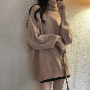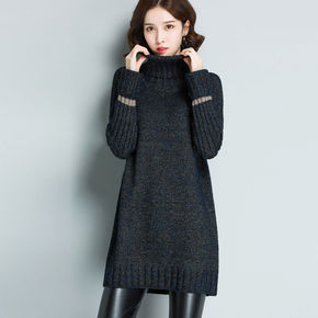 秋冬季高领毛衣女加厚中长款韩版宽松粗毛线打底连衣裙...