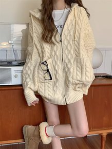 港味麻花连帽毛衣外套女秋冬设计感拉链开衫中长款慵懒...