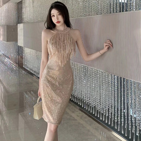 闪闪香槟金色亮片修身显瘦无袖背心连衣裙性感气质网纱...