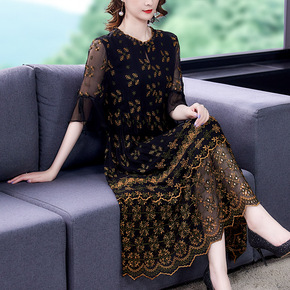 妈妈夏装连衣裙2022新款中年女短袖洋气遮肚显瘦烫...