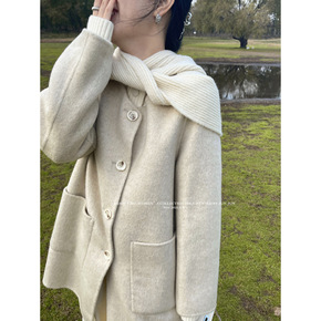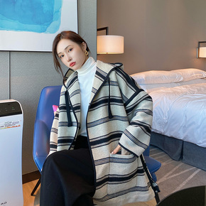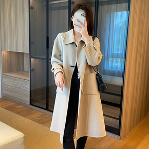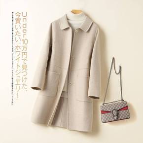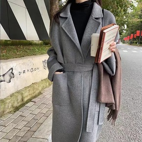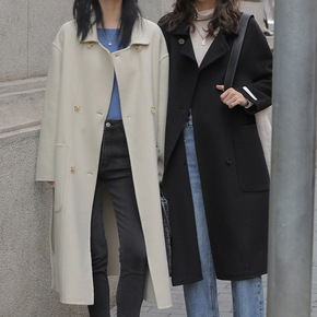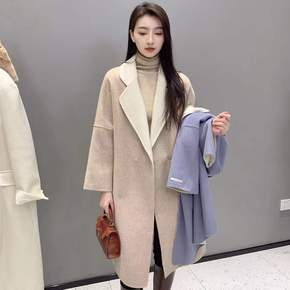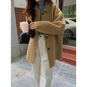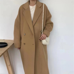 双面呢大衣女新款韩版双排扣宽松简约款...