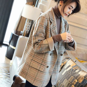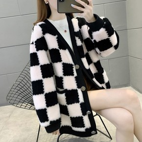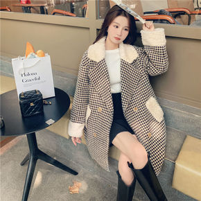 千鸟格呢子大衣女2021新款高级感羊羔毛拼接小个子...