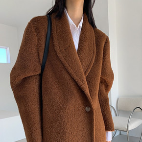 简极弧度天鹅领单排扣苏力长毛绒双面羊毛呢子大衣女2...