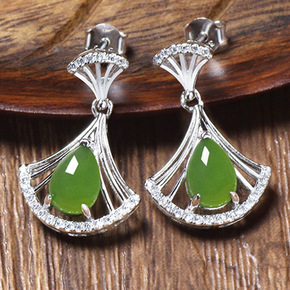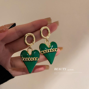 925银针绿色爱心链条耳环韩风滴油夸张耳钉耳坠in...