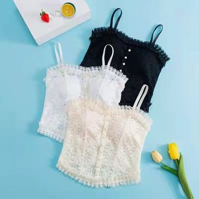 2022新款珍珠扣蕾丝碎花吊带背心裹胸美背一体式后...