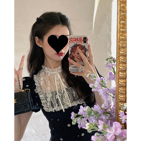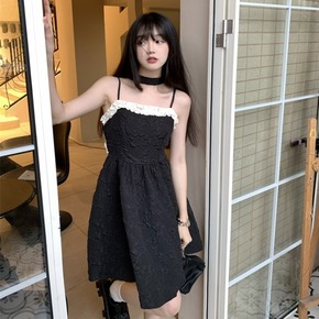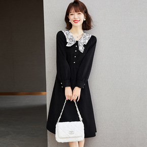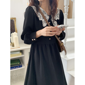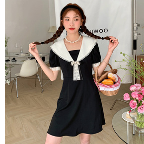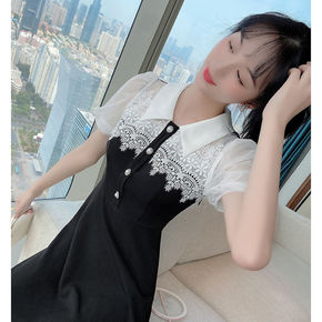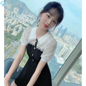 娃娃领连衣裙夏法式蕾丝边领拼接娃娃领小黑裙女夏季大...