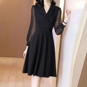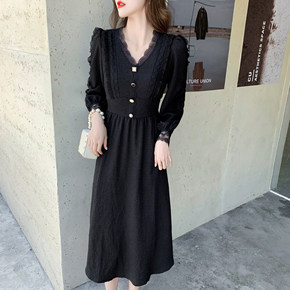 黑色女蕾丝收腰气质显瘦长袖仙女裙子春季别致赫本风小...