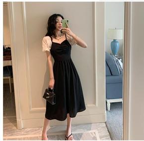 蕾丝拼接茶歇法式复古黑色碎花连衣裙女夏温柔高级感赫...
